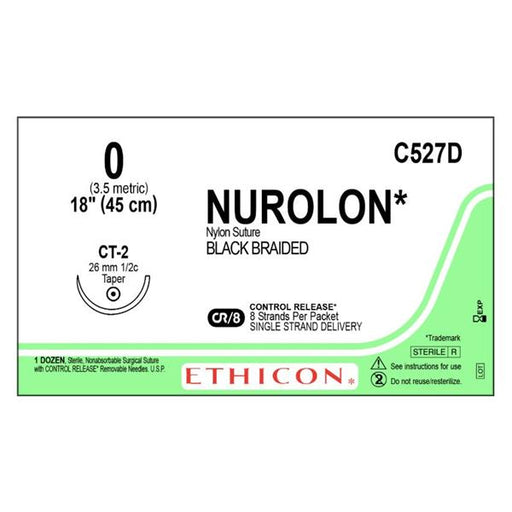 View full detailsProduct Description: Suture 0 Nylon CT-1 Nurolon 8-18" Coated Non-Absorbable Braid Black 36mm 1/2 Circle Needle Taper Point Disposable 12/BoxPart N...