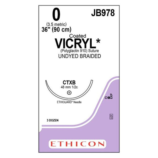 View full detailsProduct Description: Suture 0 Polyglactin 910 CTXB Vicryl 36" Coated Absorbable Braid Undyed 48mm 1/2 Circle Needle Blunt Taper Point Disposable 36...