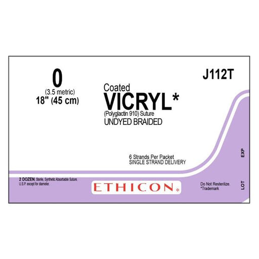 View full detailsProduct Description: Suture 0 Polyglactin 910 No Needle Vicryl 6-18" Coated Absorbable Braid Undyed Disposable Sutupak 24/BoxPart Number: J112T Abs...