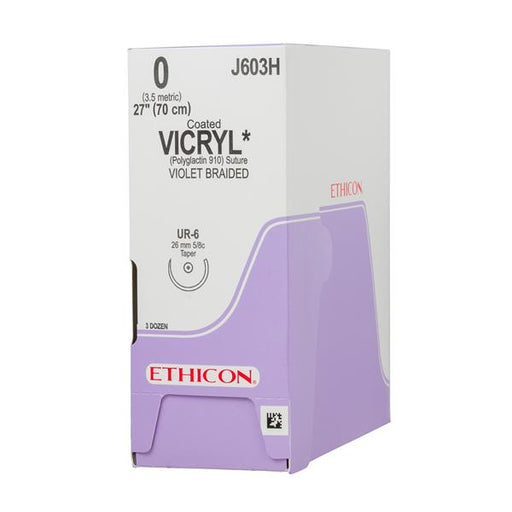 View full detailsProduct Description: Suture 0 Polyglactin 910 UR-6 Vicryl 27" Coated Absorbable Braid Violet 26mm 5/8 Circle Needle Taper Point Disposable 36/BoxPa...
