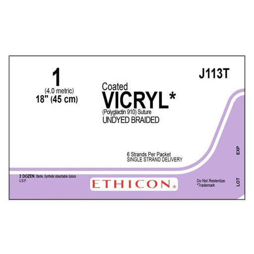 View full detailsProduct Description: Suture 1 Polyglactin 910 No Needle Vicryl 12-18" Coated Absorbable Braid Undyed Disposable Sutupak 12/BoxPart Number: J913G Ab...