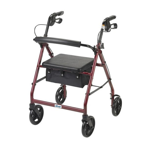 View full detailsProduct Description: Rollator Walker 300lb Capacity Red 6" Wheels 27.5x24.5x32-37" Deluxe Loop Lock Brakes Adult Aluminum Padded Seat Fold Up Remov...